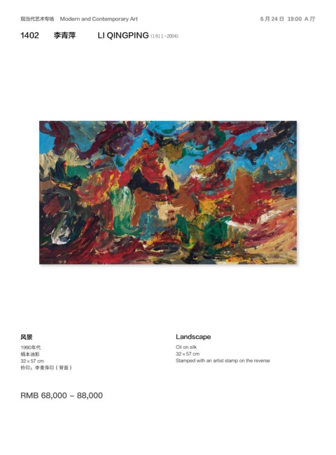 现当代艺术专场 Modern and Contemporary Art 6 月 24 日 19:00 A 厅 1402 李青萍 LI QINGPING (1911-2004) 风景 Landscape 1990年代 Oil on silk 绢本油彩 32×57 cm 32×57 cm Stamped with an artist stamp on the reverse 钤印:李青萍印(背面) RMB 68,000 - 88,000