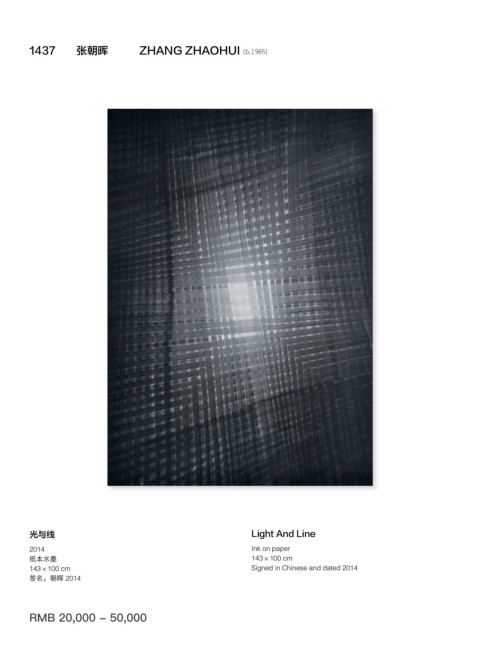 1437 张朝晖 ZHANG ZHAOHUI (b.1965) 光与线 Light And Line 2014 Ink on paper 纸本水墨 143×100 cm 143×100 cm Signed in Chinese and dated 2014 签名:朝晖 2014 RMB 20,000 - 50,000