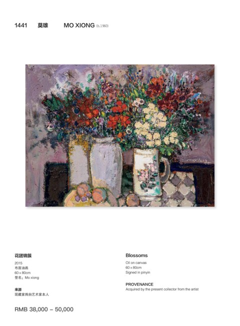 1441 莫雄 MO XIONG (b.1960) 花团锦簇 Blossoms 2015 Oil on canvas 布面油画 60×80cm 60×80cm Signed in pinyin 签名:Mo xiong PROVENANCE 来源 Acquired by the present collector from the artist 现藏家购自艺术家本人 RMB 38,000 - 50,000