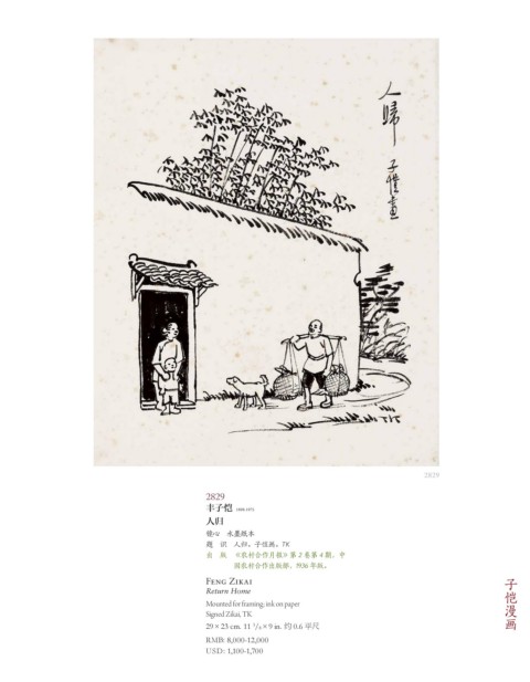 2829 2829 丰子恺 1898-1975 人归 镜心 水墨纸本 题 识 人归。子愷画。TK 出 版 《农村合作月报》第 2 卷第 4 期,中 国农村合作出版部,1936 年版。 子恺漫画 Feng Zikai Return Home Mounted for framing; ink on paper Signed Zikai, TK 3 29×23 cm. 11 /8×9 in. 约 0.6 平尺 RMB: 8,000-12,000 USD: 1,100-1,700